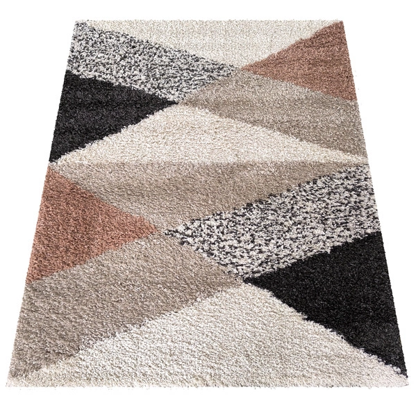Dywan Santo 02 przyciąga wzrok nowoczesnym, geometrycznym wzorem, który idealnie wpisuje się w aktualne trendy aranżacyjne. Trójkąty i romby w odcieniach beżu, rudości, bieli, czerni i melanżowego szarości układają się w dynamiczną, ale harmonijną kompozycję. Kolory są stonowane, dzięki czemu dywan pasuje zarówno do jasnych, jak i ciemniejszych pomieszczeń. Świetnie prezentuje się w połączeniu z drewnianymi meblami, a także w minimalistycznych lub skandynawskich wnętrzach, gdzie może pełnić funkcję subtelnego akcentu dekoracyjnego.