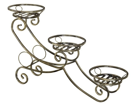 Trzy podstawki na doniczki ułożone są na różnych wysokościach, co pozwala na bardzo ciekawe wyeksponowanie ulubionych kwiatów. Kolor złotej patyny dodaje szyku i nobliwej elegancji. Kwietnik nadaje się zarówno do każdego wnętrza domu, jak ogrodu, czy balkonu. To także dobre rozwiązanie do dekoracji sal weselnych i kościołów. Stojak na kwiaty wykonany został w całości ze stali, pomalowany proszkowo co zapewnia długoletnią trwałość. Istnieje możliwość wyboru różnych wersji kolorystycznych - możemy wybrać popularną złotą patynę, szlachetną barwę srebra, niezwykły odcień miedzi, a także czerń lub biel, które szczególnie nadają się do nowoczesnych stylizacji.